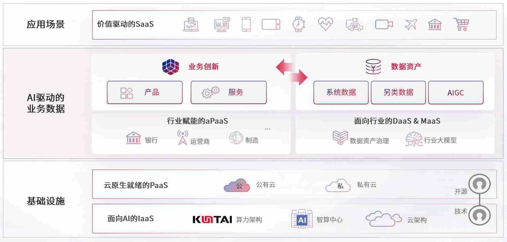 数字时代,,,围绕企业数字化转型的关键要素,,,TOP1体育数码开创性的提出数云融合战略和技术体系框架,,,,着力在云原生、、、数字原生、、AI原生和信创产业上架构产品和服务能力,,,,为处在不同数字化转型阶段的快消零售、、、汽车、、、、金融、、医疗、、政企、、、、教育、、、运营商等行业客户提供泛在的敏捷IT能力和融合的数据驱动能力,,,构建跨界融合创新的数字业务场景和新业务模式,,,助力企业级客户建立面向未来的核心能力和竞争优势,,,,全面推动社会的数字化、、、、智能化转型升级。。。